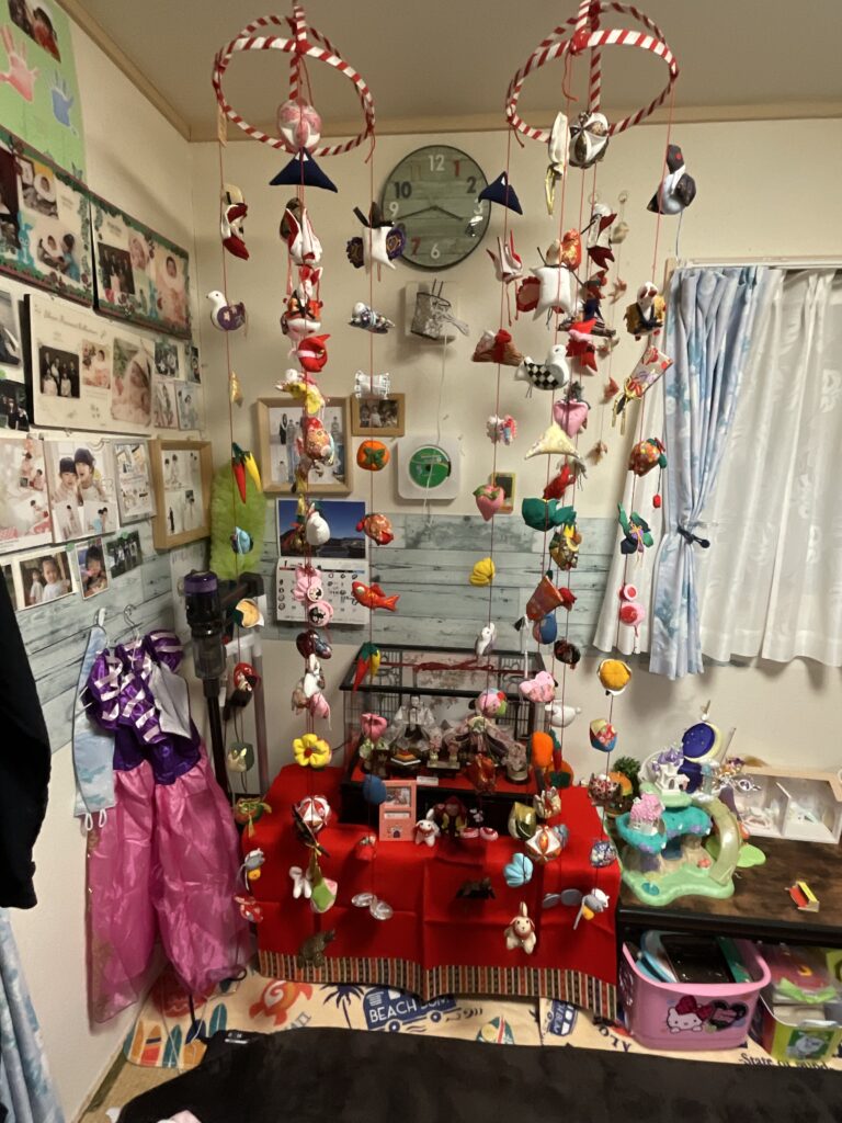 本当は10本ぐらい買って部屋中を吊るし雛にしたかったのですがこれ1本でも高価なんです。二人目が男の子だったらとも考えましたが男の子用もあるんです。でも私にはこの2本で予算一杯でした。