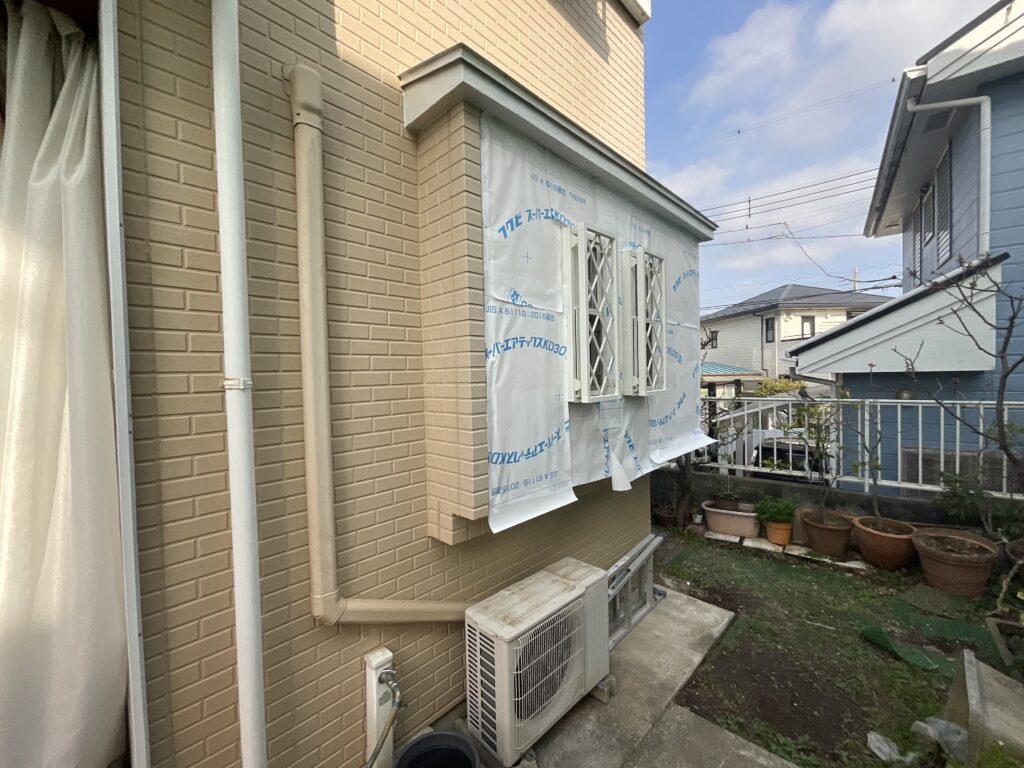 外壁はまだ途中ですが月曜日に外壁材を貼って火曜日に塗装します。この外壁は10年以上前に当社で外壁塗装をして頂きました。ユニットバスも過去に当社で工事して頂いております。