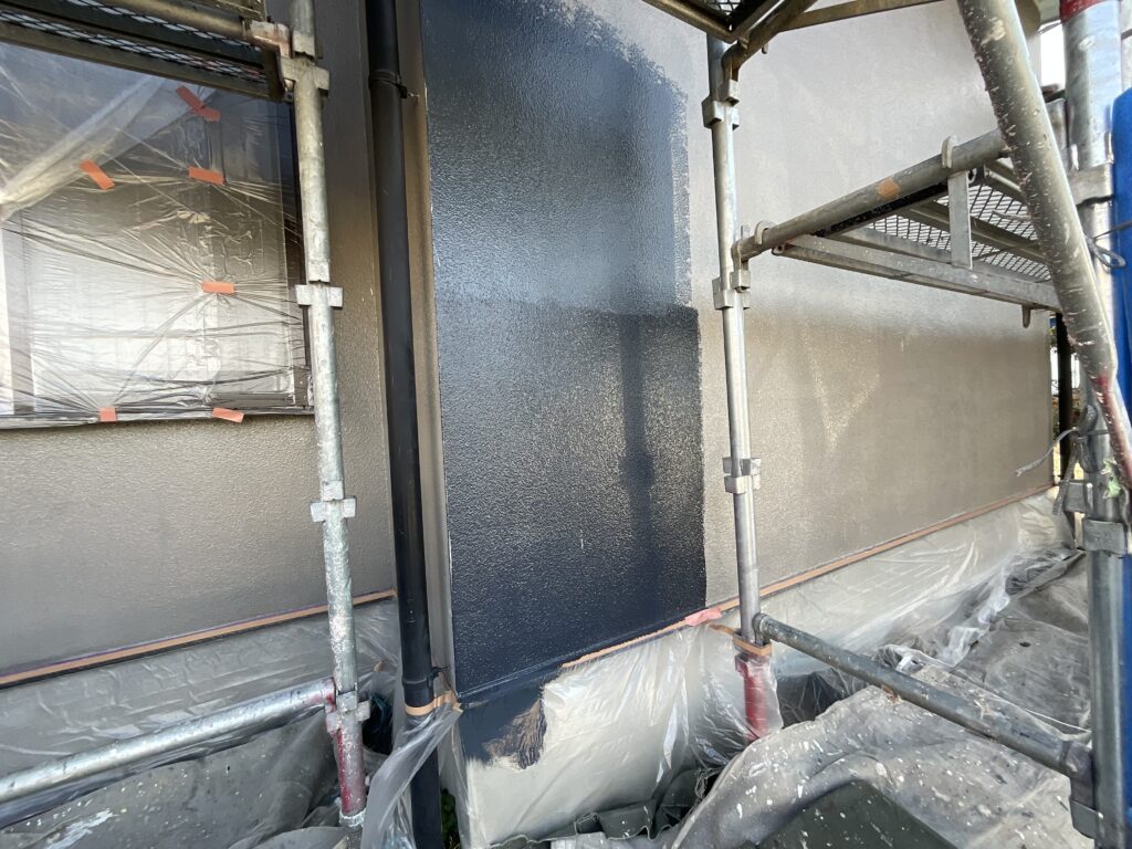 こちらは現在工事中の外壁塗装工事です。写真は外壁の色を確認するテスト塗りです。写真の濃い色が微妙に2色違うのがお分かりですか?始め打ち合わせの段階で選ばれた色より結果濃くなりました。当社ではこのテスト塗りを必ずします。当社の工事ではないのですが30年近く経験して来て色でトラブった例を多く見ました。その多くはパソコンやスマホでカラーシュミレーションしたりカタログの色見本で決めただけで終わらせた例ばかりです。当社は今までにその間違いがなかったのはこのテスト塗りを最後に現場で必ず行うからです。こうして現場でテスト塗りをして色を調合すると手間や経費はかかりますが間違いはありません。これから塗装する方は必見ですよ!