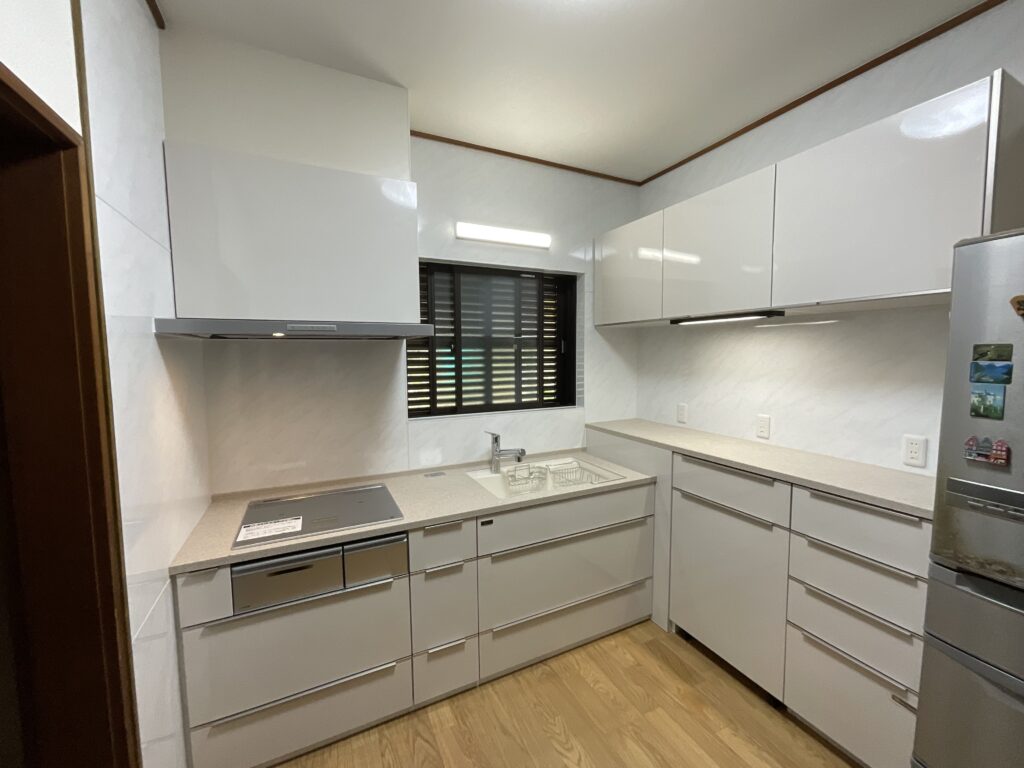 これが工事後です。タカラスタンダードのL型キッチンです。少し変則的な形でした。良く見て下さいキッチン奥のサッシも高断熱サッシに交換しています。壁や天井の内装、床のフローリングも新しくなりとても綺麗になりました。