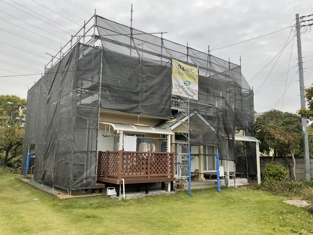 こちらも現在工事中の外装リフォーム現場です。12年前に当社で外壁塗装をして頂きました。過去には他にキッチン、バス、トイレ、収納、ウットデッキ、勝手口ドア、内装、等沢山お付き合い頂いているリピーターの方です。今回は当社で2回目の塗装工事と屋根の葺き替え、雨樋の交換を行って頂きます