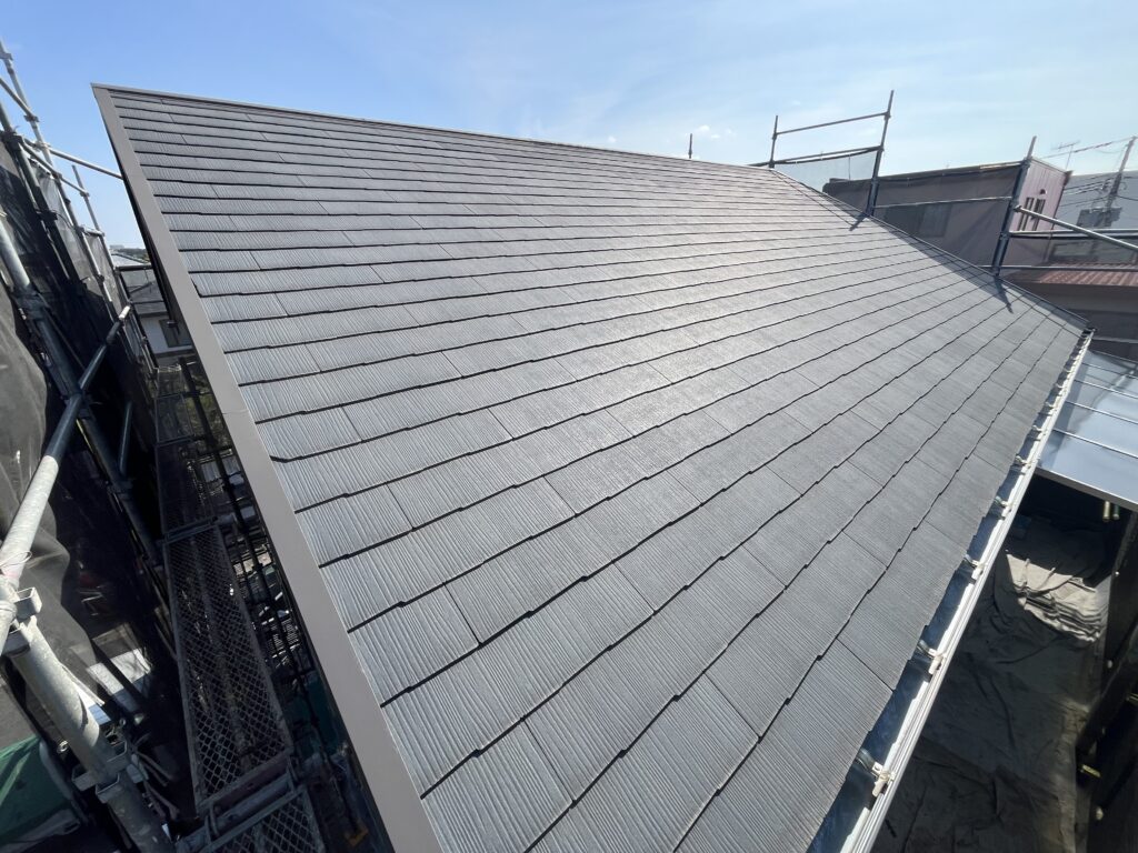 これが屋根のビフォーアフターです、築10年なので上の工事前の写真もまだ綺麗です。正直お見積りした時にまだ屋根も塗装でも大丈夫ですよとお話ししましたが、お客様がガルバ金属の重ね葺の事を知っておられて塗装の場合と葺き替えの両方で検討頂きました。