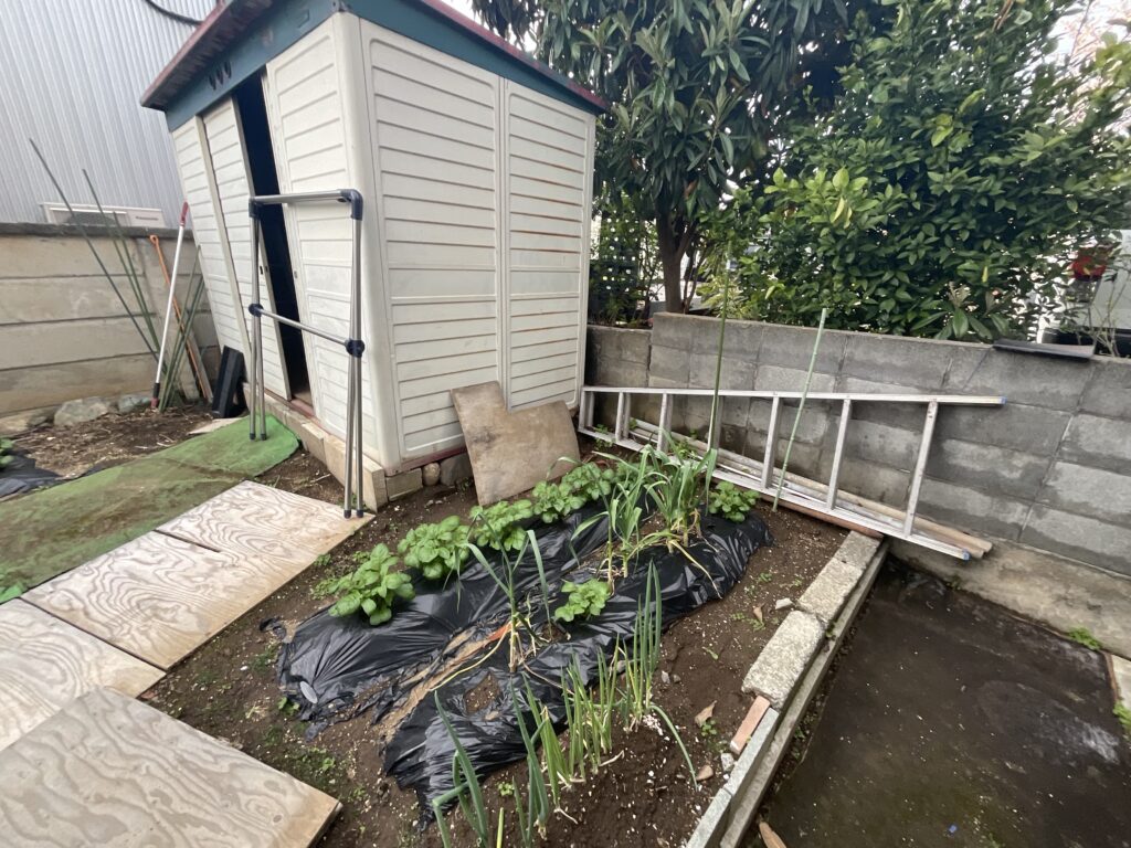 工事前はこんな感じでした。古い物置をの向こうにお隣のブロックがあります。その内側にまずブロックを積みます