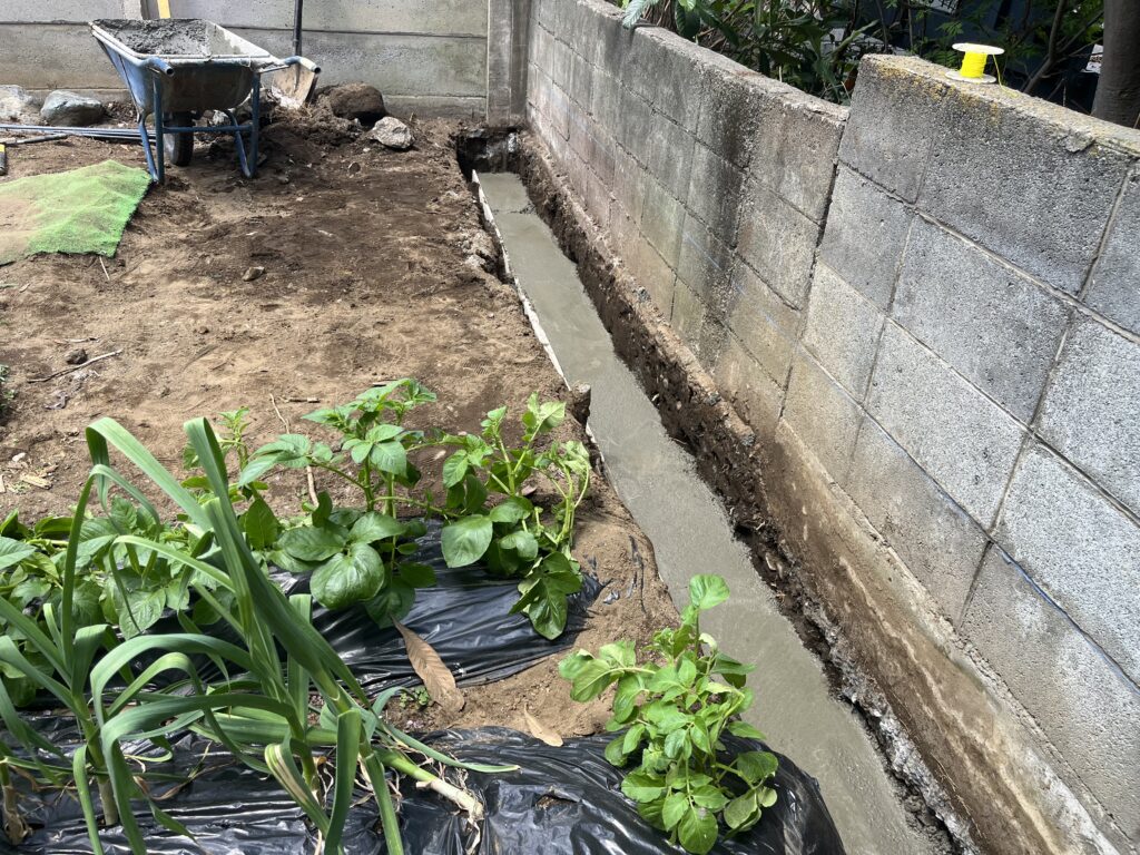 物置を撤去して土を堀りブロックを作る所に基礎を打ちます、これを専門用語でステコンと言います。これをしっかりしないとブロックが倒れてしまいます。完成すると見えなくなる部分なのですが、こういう見えない部分を手を抜いてはいけません。