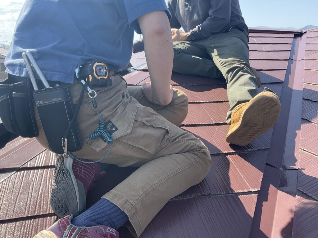 この写真は屋根を葺く職人さんと太陽光発電を脱着する職人さんの打ち合わせです。お見積もりする際も工事をする際もこの屋根の打ち合わせが重要です。当然私も屋根に上がります。この打ち合わせはドローンなんかでは絶対ダメです。細かい寸法を直に測り触らないとダメなんです。