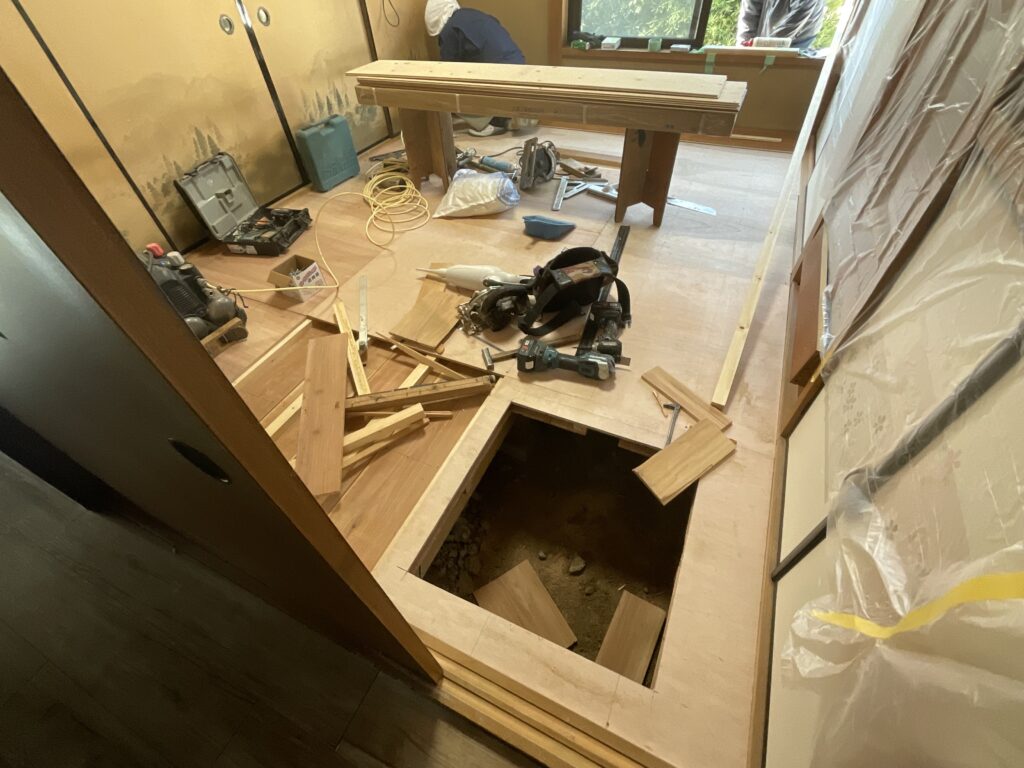 こちらは始まったばかりの床の工事です。畳をフローリングにする工事です。畳をフローリングにする工事は多いですね、まずは1Fの8畳からこの後1Fのもう一つの8畳を行いその後2Fの6畳そして2Fの廊下のフローリングと工事して頂きます。更に細かい工事が数箇所行い、少し離れた息子さんの新築の家にサンルーム、テラスを工事して頂く事になりました。こちらのお客様は10年前に屋根の葺き替え、キッチン、他色々工事して頂いたリピーターの方です。10年振りでしたが大工さんは同じ職人さんでした、普通の会社は10年すると職人さんは代わっていますが当社はどの工事も職人さんがコロコロ変わらないのが良い所です。お客さんから見ても又同じ職人さんだとホッとしますよね