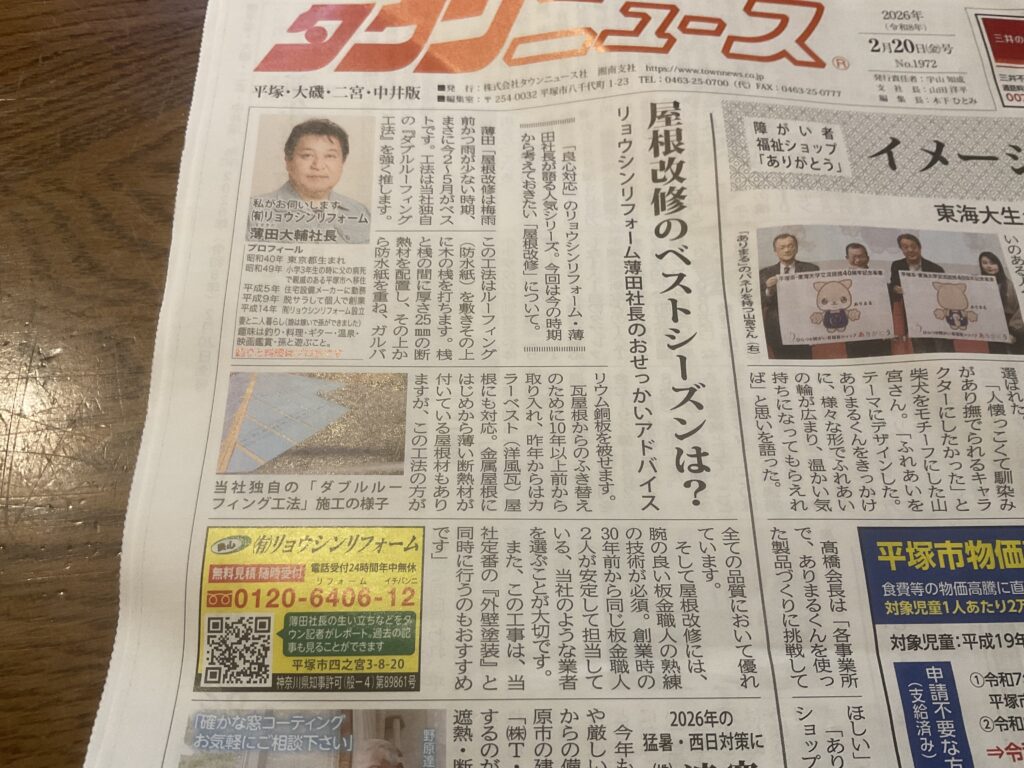 おはようございます。2月20日毎月掲載のタウンニュースに久しぶりに当社の屋根の広告が出ました早速お見積もり依頼を頂き現場調査しました。昨日ご契約を頂きました。即決で頂きました。実はすぐご近所に5年以上前に当社で工事した屋根工事のお客様いらっしゃり、そういう実績があったからでしょう?それも一軒ではなく3軒も同じ町内にいらして、この町内にはまるでリョウシンリフォーム屋根工事集中地区と命名させて頂きました。