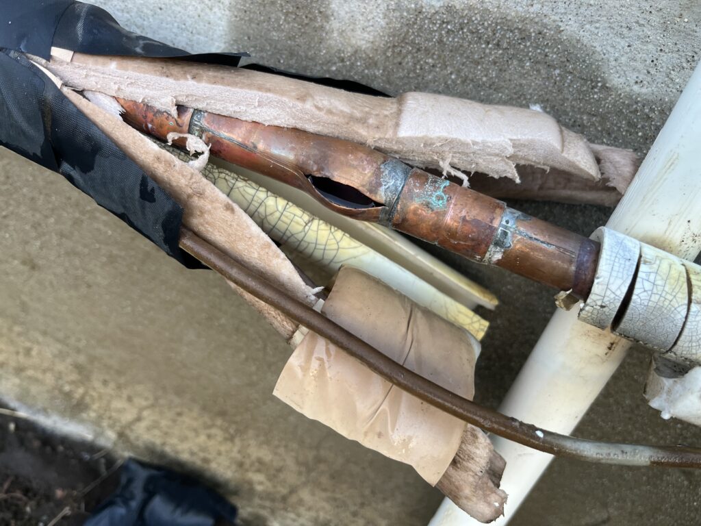 配管をみるとお湯の配管がパックリと口を開きお湯がどんどん出ています、この配管は家を建て時からの古い配管です。なんとか緊急工事となりまして直りました。リピーターの方でしたのですぐ対応致しました